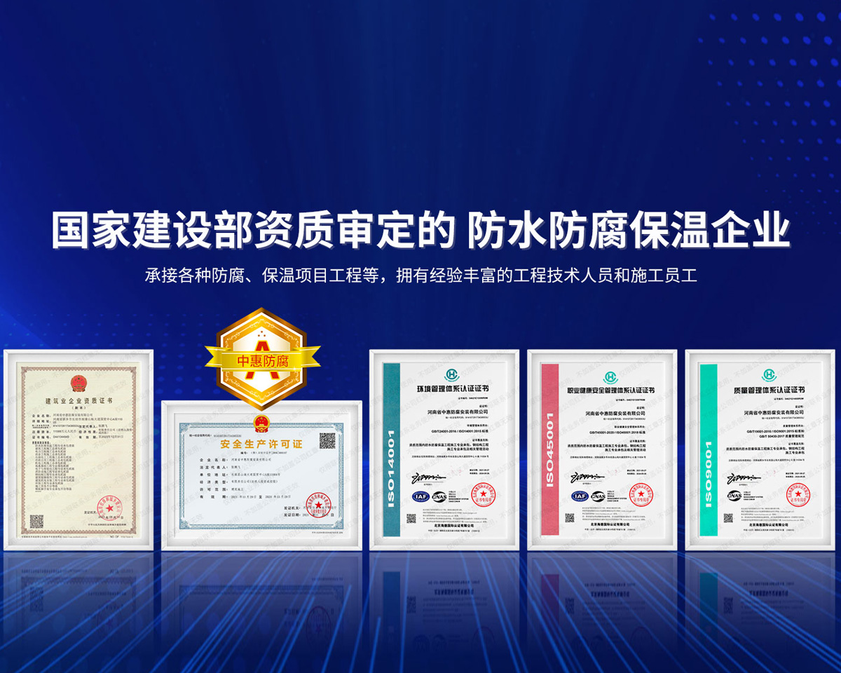 公司經營范圍:防水防腐保溫工程;消防設施工程;建筑裝修裝飾工程;建筑機電安裝工程;電力工程;建筑工程;石油化工工程;工業清洗工程;油罐清洗工程;鋼結構工程;環保工程;模板腳手架工程;電纜防火封堵、防污閃噴涂、外墻外保溫工程;各類施工勞務作業;設備維修、船舶鉚焊、涂裝;電力工程材料、建材、防水材料、防火材料、防腐保溫材料銷售,并相繼通過了GB/T19001-2008idtISO9001:2008GB/T50430-2007質量管理體系認證證書。GB/T24001-2004idtISO14001:2004環境管理體系認證證書。GB/T28001-2011idtOHSAS18001:2007職業健康安全管理體系認證證書。公司是中國防腐蝕于防護協會、中國施工企業管理協會、電力協會和中國鋼結構防水協會會員單位?! 」镜慕洜I業務涵蓋了石油、化工、電力、冶金、煤炭、船舶、國防、燃氣、水利、環保、交通運輸、航空及國防軍工和輕紡市政等行業的防腐保溫絕熱設備。鋼結構安裝、防火、防水、金屬噴鍍、聚脲噴繪、陰極保護、防滲透堵漏、玻璃鋼及各種磚版材料襯里、橡膠襯里、煙氣硫和耐酸溶劑腐蝕等工程施工。公司連續十年榮獲“省市先進施工企業”“安全生產先進單位”“重合同,守信用企業”和“AA***資質企業”的稱號。2000年被命名為市級文明單位,2002年被國家工商行政管理局命名為“重合同,守信用的企業”、被中國工業防腐蝕技術協會命名為“防腐蝕企業,能源節約及環境保護領域有豐富的經驗和***的業績。工程一次交驗合格率100%。其中攀枝花鋼鐵公司煉鐵廠四號高爐及熱風爐防腐工程、上海寶鋼公司煤氣柜防腐工程、撫順石油一廠裝置防腐項目、齊魯石化公司稀烴廠高塔防腐工程、吉林化學工業公司煉油廠油罐防腐工程、天津石化熱電廠六號爐頂棚聯絡管保溫工程、大慶油田(太倉)力神泵業工程、中國化學工程第十一建設工程、中原油田勘探局工程、中國石化銷售有限公司華北分部、魯皖輸油管道工程、貴州開磷息烽合成氨工程、陜西黃陵煤化工程、中國石油天然氣西部管道塔里木輸油工程、邯鋼集團邯寶鋼鐵公司煉鐵工程、德州供電工程、吉寶(南通)船廠工程,偃師華潤熱力工程、鄭州熱力總公司。 河南省中惠防腐安裝有限公司愿以豐富的施工經驗,***的技術,***的設備,***的管理,***的服務,竭誠為國內外廣大的用戶提供***滿意、******的工程作品?! ∥夜驹概c國內外同仁一道,團結協作,共同推進防腐蝕行業發展! 公司地址:河南省長垣縣建設路北段360號 固定電話:0373-8866488 郵編:453400 網址:http://www_zhff_com_cn.xjweiyao.com